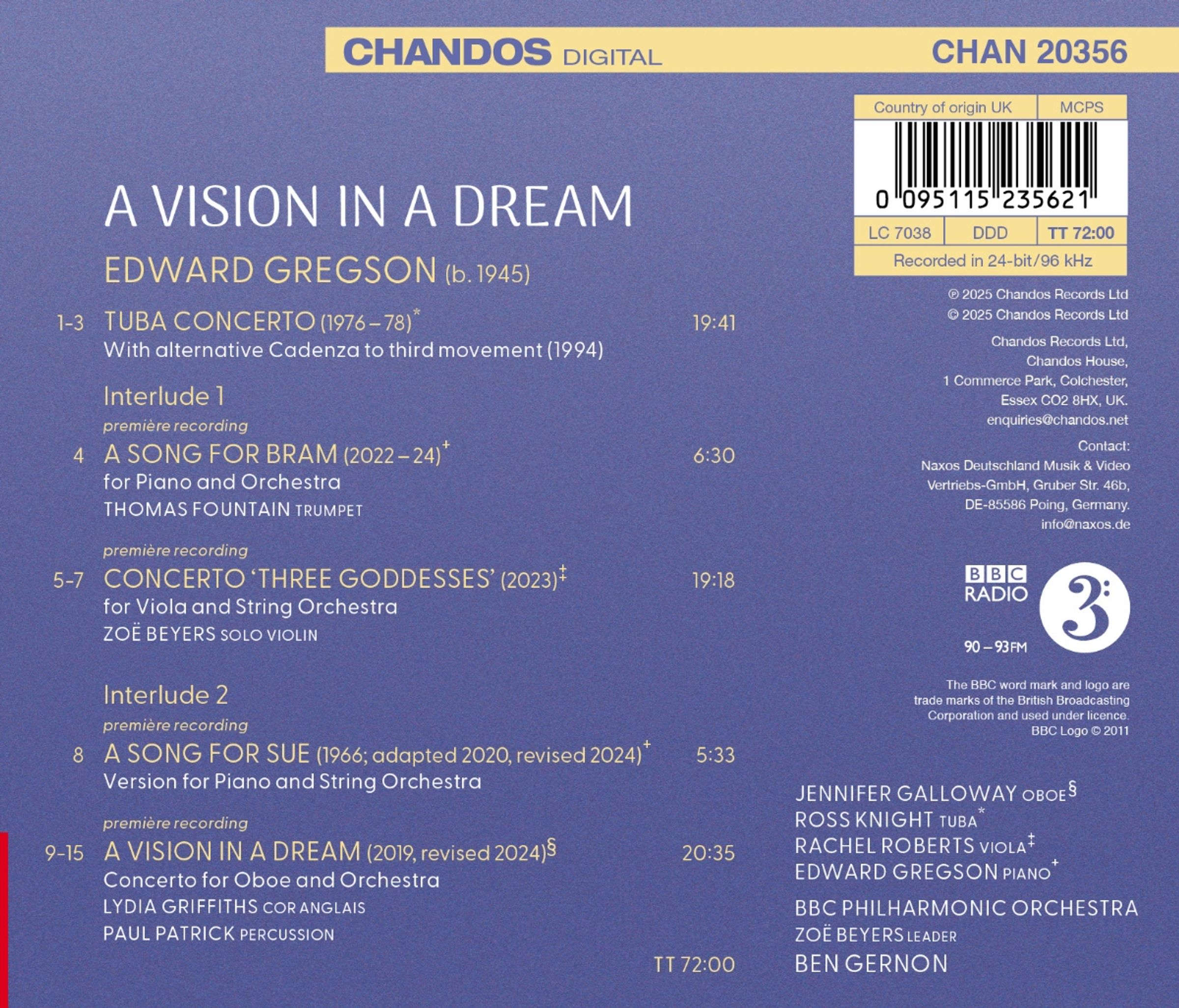 An award-winning English composer of international standing, and one of the leading composers of his generation, whose music has been performed, recorded, and broadcast in many countries, Edward Gregson celebrates his eightieth birthday in 2025. He continues to compose and perform as actively as ever. This album presents three major concertos, interspersed with two shorter works for piano and orchestra. A Song for Bram was written in memory of his great friend and advocate, the conductor Bramwell Tovey. A Song for Sue, re-working the central Nocturne from his Concertante for Piano and Brass Band (1966), is a 2024 tribute to his wife.