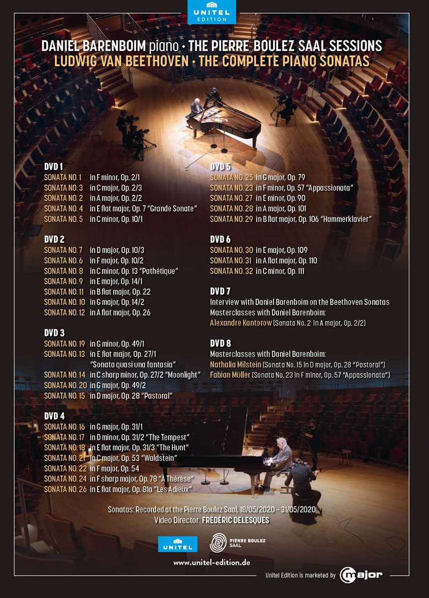 Few musicians in the world are as intimately familiar with Beethoven’s piano sonatas as Daniel Barenboim, who has been exploring these works since the earliest days of his career - a musical novel in 32 chapters and an artistic cosmos in itself. Barenboim recorded the full cycle of Beethoven sonatas in the Pierre Boulz Saal in 2020 and presents these works in chronological order of their creation - providing an exciting look at the composer’s artistic development. With this sonata cycle, Daniel Barenboim has set himself a legacy! The box includes 234 mins Bonus: a 42-minutes interview with Daniel Brenboim on Beethoven and 3 masterclasses with Daniel Barenboim, working with students of the Barenboim-Said Academy feat. Alexandre Kantorow (winner of the 1st price and gold medal at the Tschaikowsky Competition, working on Sonata No. 2), Nathalia Milstein on Sonata No. 15 “Pastoral” and Fabian Müller on Sonata No. 23 “Appassionata”). “No matter how many times you play them there are always fresh personal perspectives waiting to be discovered.” Daniel Barenboim