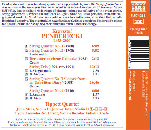 Penderecki wrote music for string quartet over a period of 56 years. His String Quartet No. 1 was written in the same year that he achieved international success with Threnody (Naxos 8.554491), and includes a wide range of playing techniques reflective of the avant-garde. String Quartet No. 2 reveals the influence of Ligeti, while No. 3 is a personal, even autobiographical work. In No. 4 there are modal or even folk inflections, in writing that is both limpid and abrasive. The eventful Der unterbrochene Gedanke completes Penderecki’s music for quartet, while the String Trio exemplifies his music’s motoric energy.