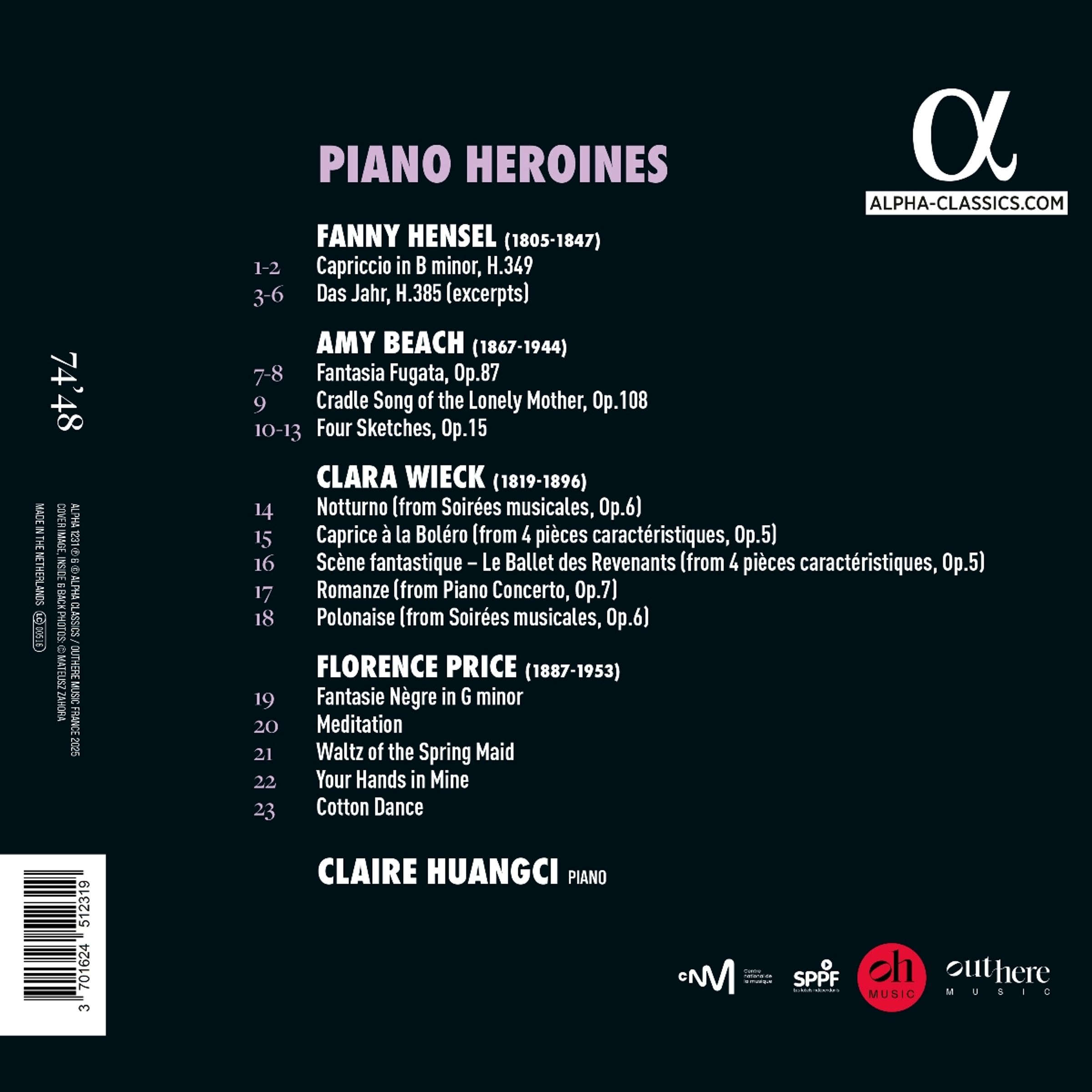 After a 'spellbinding' album for Alpha devoted to her American roots (Alpha1071), pianist Claire Huangci now celebrates female composers, acknowledging: ‘The realities these women faced are difficult to imagine for any modern woman in the field.’ Clara Wieck (who became Schumann after her marriage to Robert in 1840) was a mother of eight and the main breadwinner, constantly on tour. Fanny Hensel composed largely in private, often publishing under her brother’s name. Amy Beach’s career was practically silenced during her marriage; only upon her husband’s death did she return to the stage. Florence Price faced both racial and gender discrimination and later raised two children alone. Across the centuries, the voices of these women reach us thanks to musicians like Claire: 'In their music, we don’t just hear history. We hear transformation. Heroines is my way of listening back—and adding my voice to theirs.'