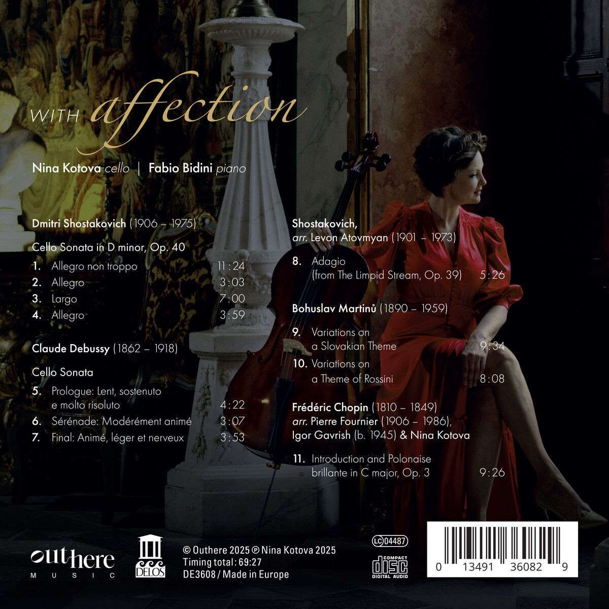 Fittingly titled With Affection, Nina Kotova's latest album for Delos is a glorious showcase of some superlative cello works that are close to her heart. Starting with Shostakovich's Cello Sonata, a work blending classical form with simplicity and clarity, the program moves on to Debussy's evergreen Cello Sonata, which in contrast is elusive and whimsical, and Nina's inspired rendition of a rarity, Shostakovich's Adagio from The Limpid Stream. Martinu's Variations on a Slovakian Theme and Variations on a Theme of Rossini are both virtuosic and playful, showcasing his distinct rhythmic and lyrical style. The recital concludes with Chopin's Introduction and Polonaise Brillante in an arrangement that blends expressive cello lines with brilliant piano passages - played by Nina's partner on this album Fabio Bidini - creating an exuberant and captivating work.